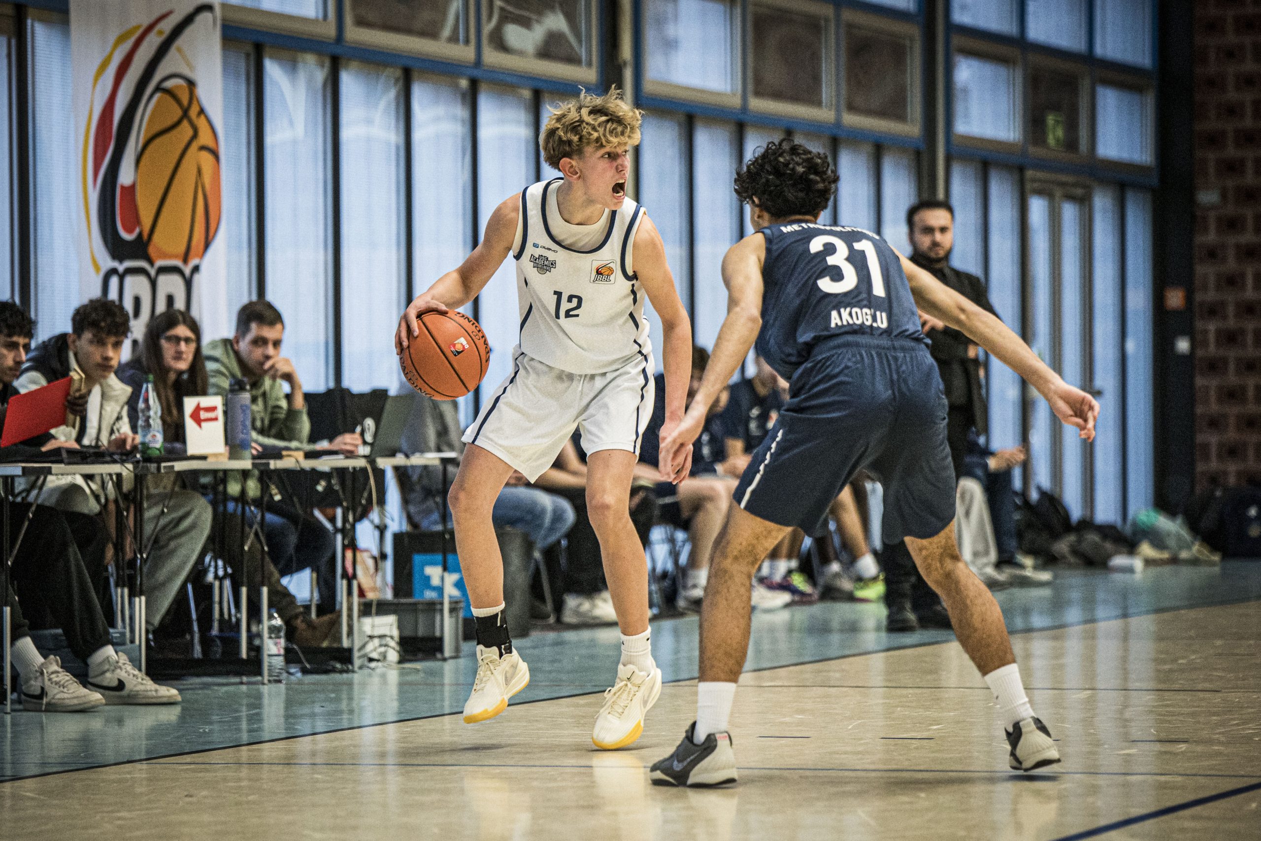 Fin Agena – 20251130_019 Fin Agena (#12, USC Heidelberg) am Ball beim JBBL Spiel USC Heidelberg – Rhein-Neckar Metropolitans
