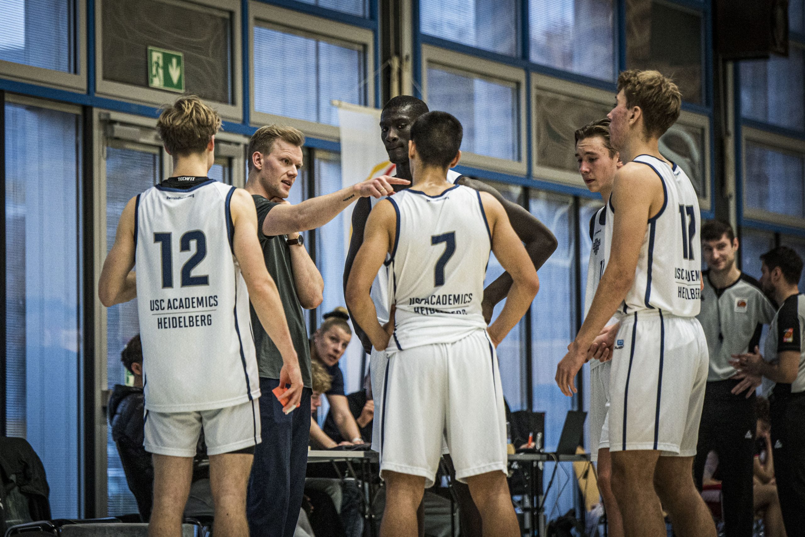 20251130laUSCHeidelbergVRBankWuerzburgBasketsAkademie_011 Lennart Stechmann (Headcoach, USC Heidelberg) gibt Anweisungen / gestikuliert mit den Armen beim NBBL Spiel USC Heidelberg – VR-Bank Wuerzburg Baskets Akademie.