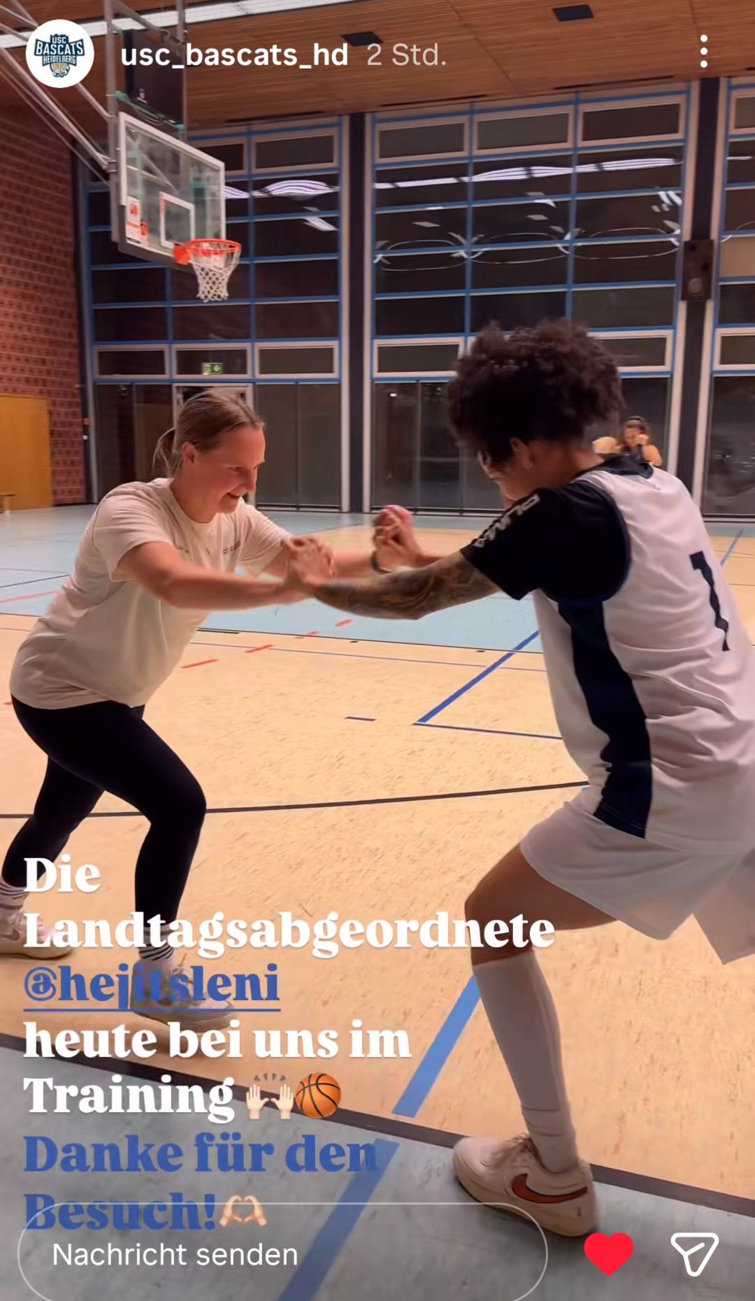 Nach der erfolgreichen Spendenaktion im „Pinktober“ findet in der Halbzeitpause des Derbys eine symbolische Spendenübergabe der BasCats an die Frauenselbsthilfegruppen Krebs Heidelberg und Mannheim statt. Zwei Vertreter der Gruppe werden vor Ort. Ebenso die Landtagsabgeordnete Dr. Marilena Geugjes (Bündnis 90 Die Grünen). Sie war am Dienstag beim Training der USC BasCats zu Gast und trainierte auch ein wenig mit. Geugjes sitzt seit 2019 im Heidelberger Gemeinderat und rückte im Juni 2024 für Theresia Bauer in den baden-württembergischen Landtag nach.